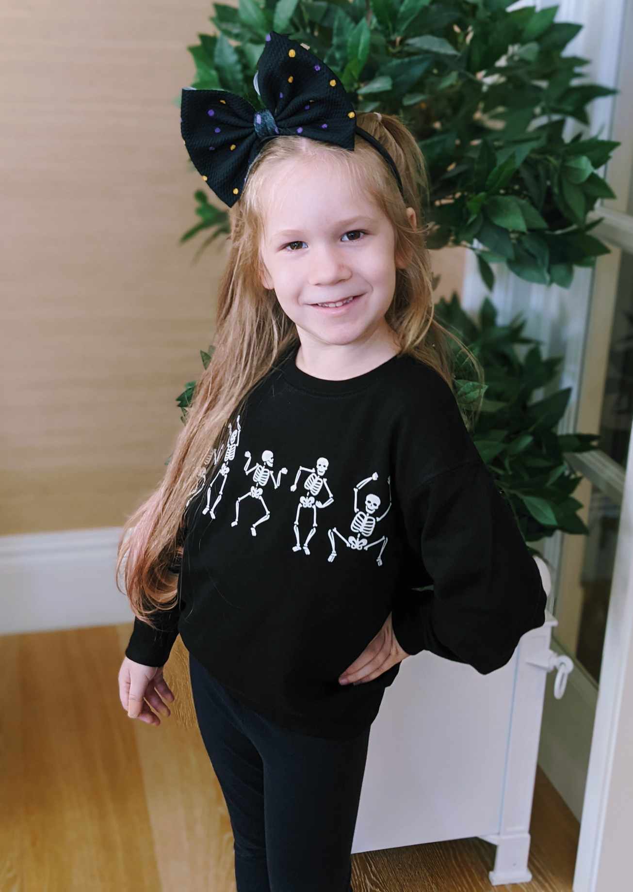 Get your little one in on the spooky fun with our Dancing Skeleton crewneck for children! Perfect for matching with our "mom and me" option, this playful top features a dancing skeleton graphic. Get ready to boogie in style!